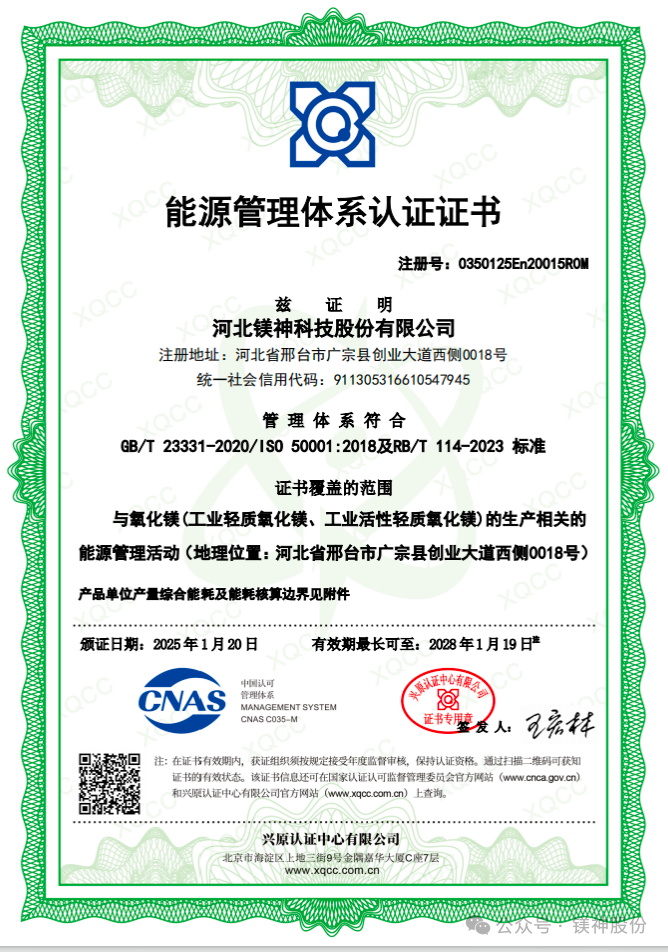 近日,河北鎂神科技股份有限公司獲能源管理體系認(rèn)證證書,成為行業(yè)內(nèi)首家通過這一重要認(rèn)證的企業(yè)。這標(biāo)志著公司在能源管理體系建設(shè)方面達(dá)到了新的里程碑,進(jìn)一步鞏固了其在氧化鎂行業(yè)的領(lǐng)先地位。 ..