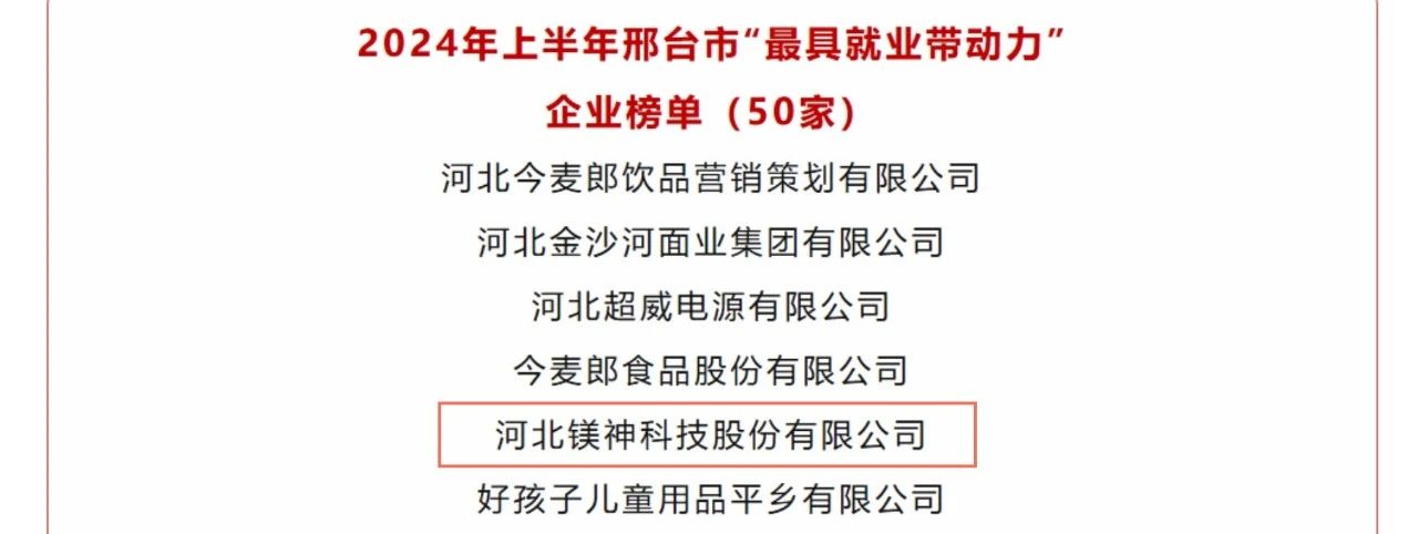 2024年7月15日 邢臺市人社局發(fā)布 邢臺市“最具就業(yè)帶動力”企業(yè)榜單 河北鎂神科技股份有限公司榮譽上榜 ..