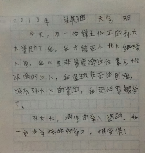 當年8月份,紀某某和賈某某兩位學生分別以優(yōu)異的成績考入石家莊鐵道學院和河北工程技術學院。因家庭收入過低,無法支付昂貴的學費,家人一籌莫展,得知情況后,孫文董事長慷慨解囊,分別給予紀某某10000元、賈某某6000元的資助。受助家長激動地說,真不知道怎么感謝董事長的恩情,兩位學生表示,一定不辜負孫文董事長的愛心和厚望,努力學習,用優(yōu)異的成績回報社會。