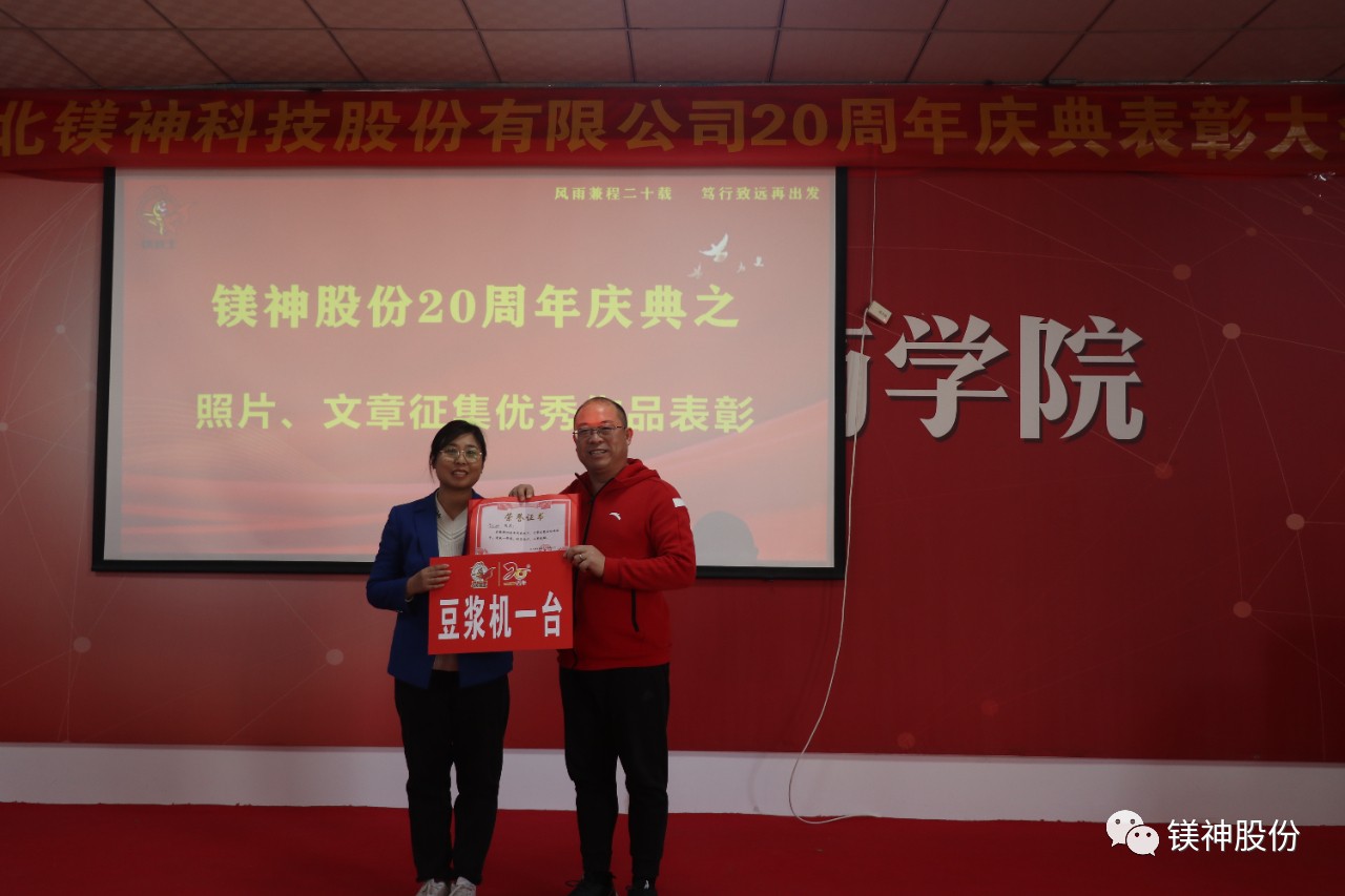 與慶典表彰大會一同舉辦的還有二十周年慶相關(guān)征文活動頒獎典禮。海南公司員工李紅嬌的作品“獻給鎂神二十周年”拔得頭籌。