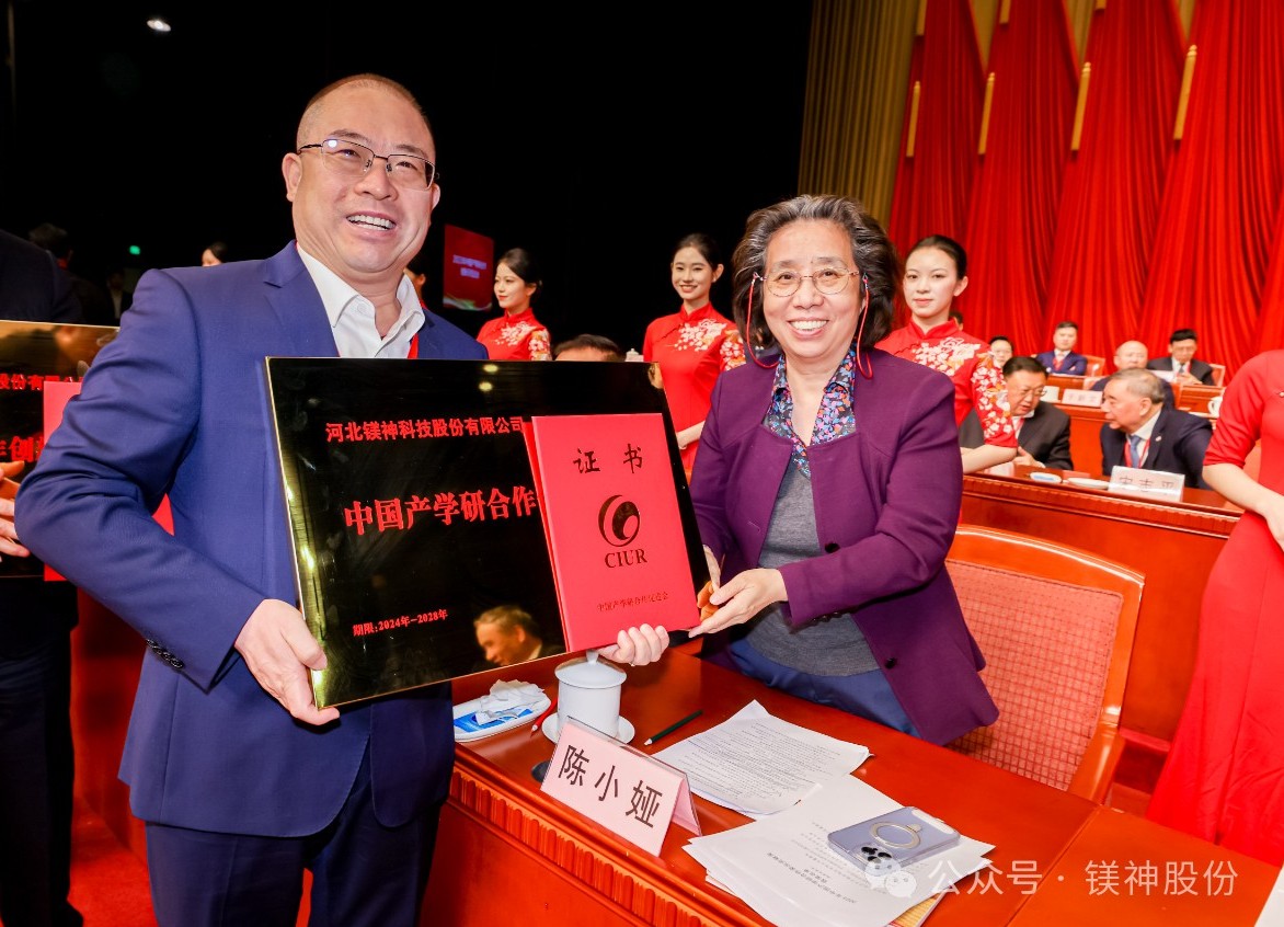 3月17日,以“產(chǎn)學(xué)研聚焦:新動能、新模式、新產(chǎn)業(yè)”為主題的第十五屆中國產(chǎn)學(xué)研合作創(chuàng)新大會在北京會議中心隆重召開,河北鎂神科技股份有限公司董事長孫文受邀出席。會議表彰了2023年在產(chǎn)學(xué)研深度融合方面做出貢獻(xiàn)的先進(jìn)單位和個人,河北鎂神科技股份有限公司榮獲“中國產(chǎn)學(xué)研合作創(chuàng)新示范企業(yè)”,中國產(chǎn)學(xué)研合作促進(jìn)會特聘專家、科技部原副部長陳小婭為我司頒發(fā)榮譽證書。