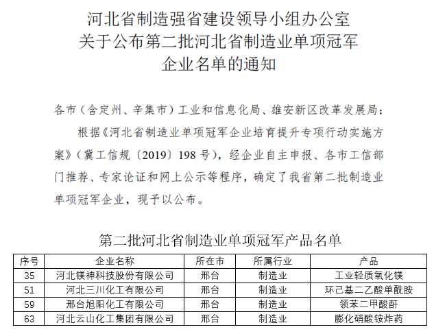 新年新氣象,企業(yè)再添新榮譽(yù),爭得開門紅,近日,河北省工業(yè)和信息化廳官方網(wǎng)站公布了2020年“制造業(yè)單項(xiàng)冠軍產(chǎn)品”企業(yè)名單,我公司生產(chǎn)制造的“工業(yè)輕質(zhì)氧化鎂”獲得了河北省制造強(qiáng)省建設(shè)領(lǐng)導(dǎo)小組授予的“制造業(yè)單項(xiàng)冠軍產(chǎn)品”稱號。本次邢臺市通過4家,我們是其中1家。