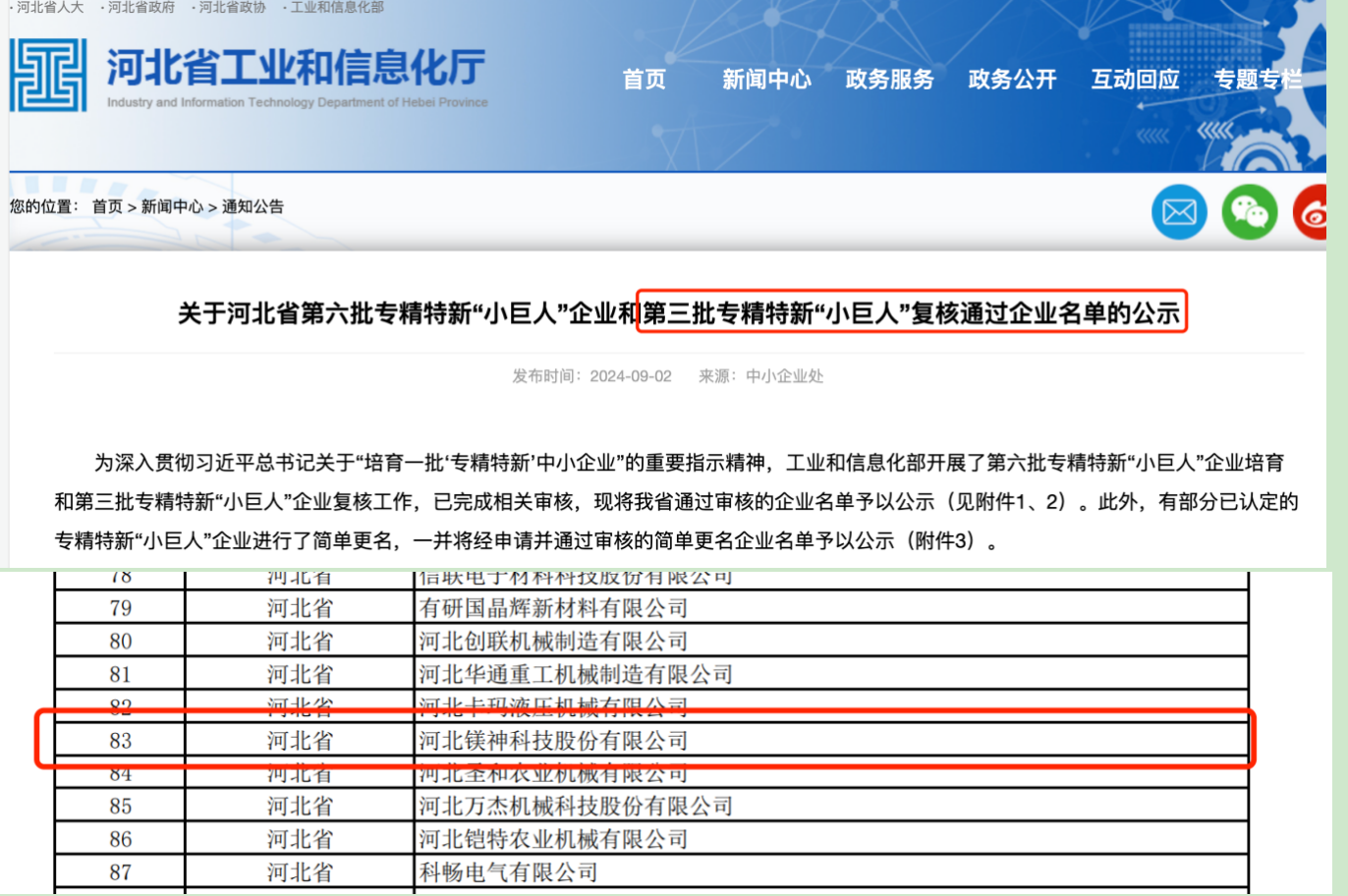河北鎂神科技股份有限公司近日喜訊連連,成功通過了國家級“專精特新小巨人”企業(yè)的復審。
