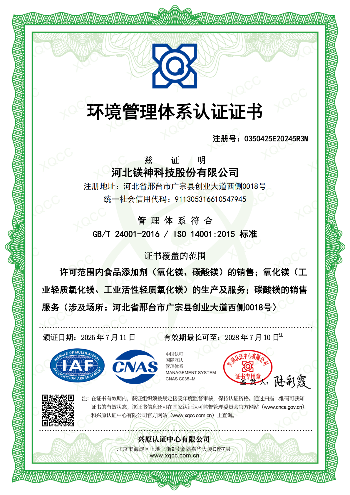 環(huán)境管理體系認(rèn)證證書