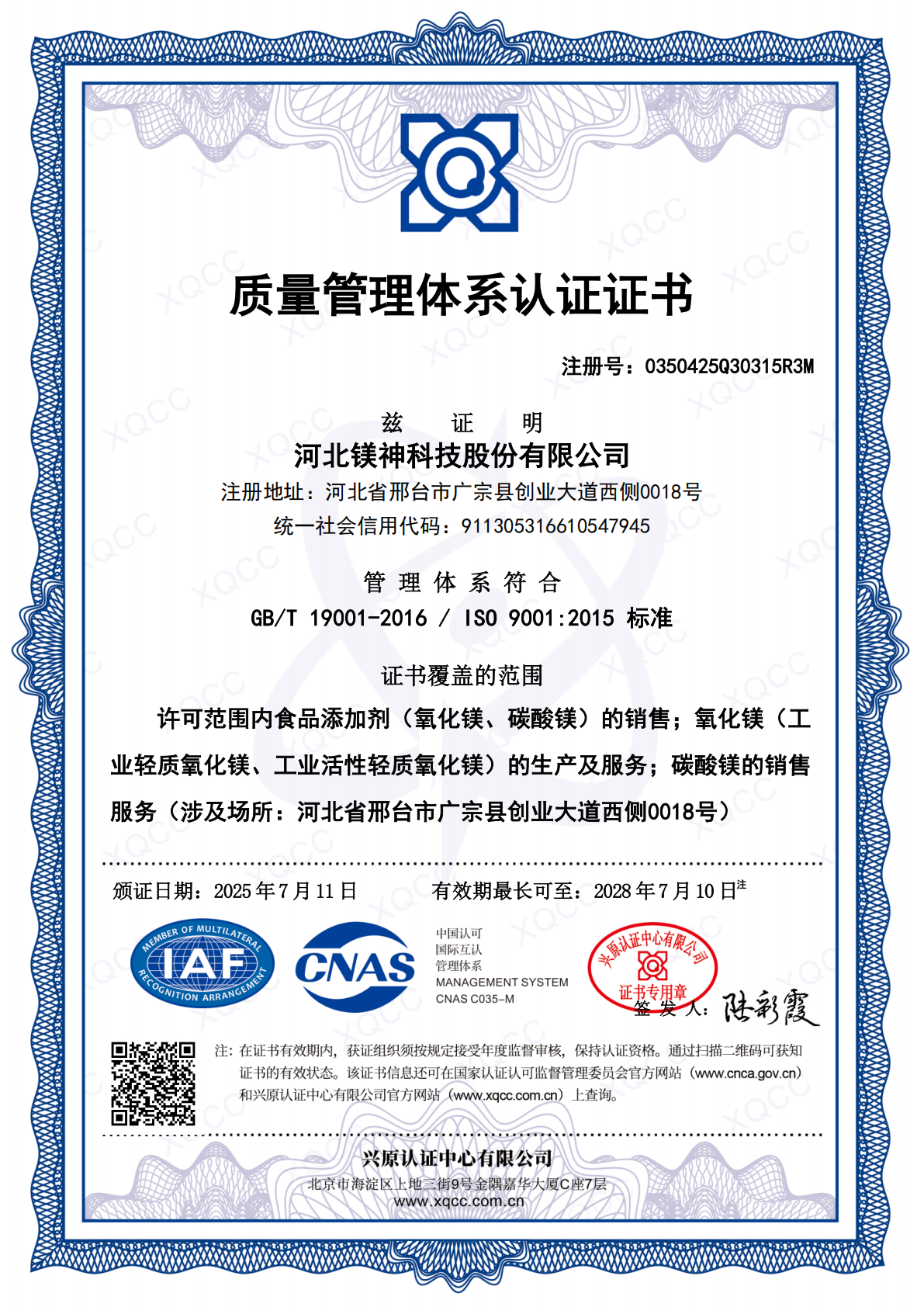 質(zhì)量管理體系認(rèn)證證書