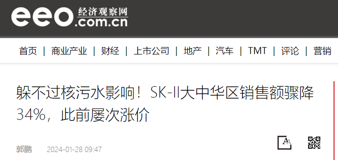 此外,據(jù)日本東電對(duì)外公布的計(jì)劃顯示,日本福島核電站計(jì)劃于2024年排放約5.4萬噸核污水至海洋。這一舉動(dòng)無疑將對(duì)日本的鎂鹽產(chǎn)業(yè)造成更大的沖擊。且市場(chǎng)對(duì)日本鎂鹽下游產(chǎn)品反應(yīng)更加明顯,尤其是在日化這樣廣泛添加鎂鹽又與人們?nèi)粘I蠲芮邢嚓P(guān)的領(lǐng)域,市場(chǎng)更加敏感。例如日本的SK-II品牌大中華區(qū)銷售額已驟降34%;資生堂2023年三季度中國市場(chǎng)銷售額下降20%以上。